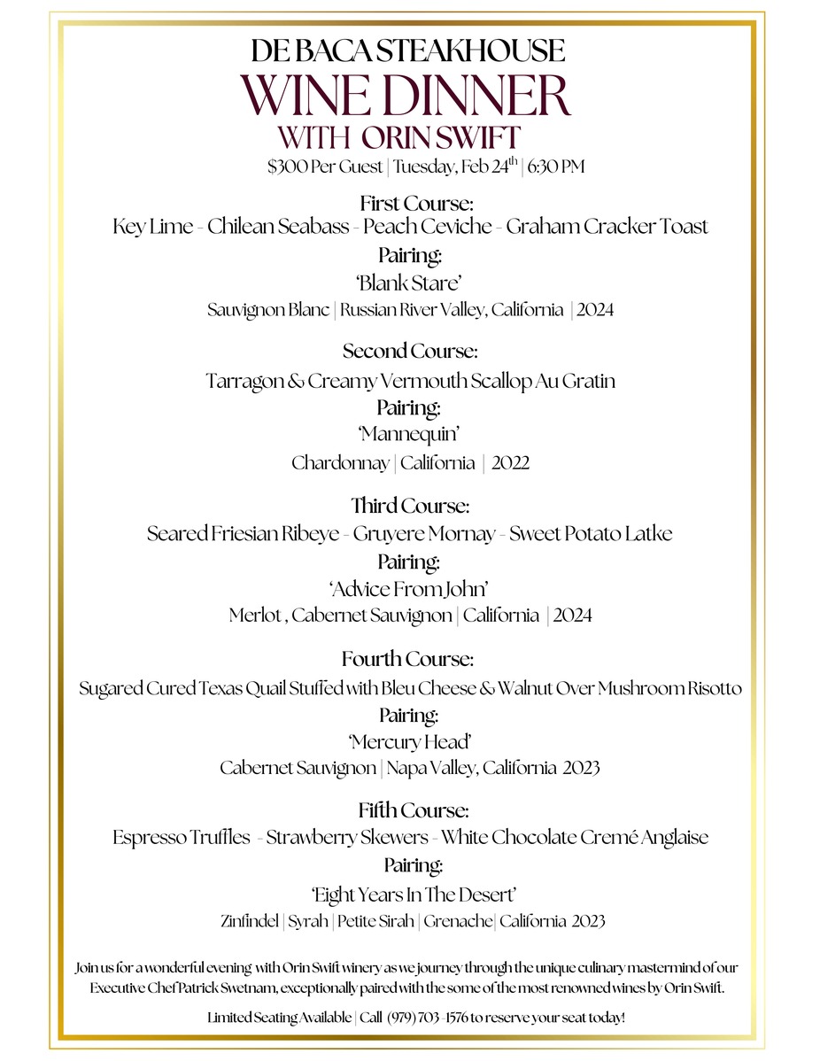 Join us for the De Baca Steakhouse Wine Dinner with Orin Swift.