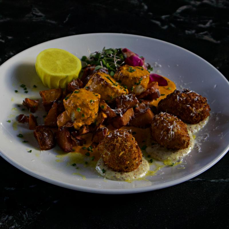 Brined and confit in duck fat, rosemary pheasant cream, served with chateau mashed potatoes, seasonal vegetables, fried yucca root.