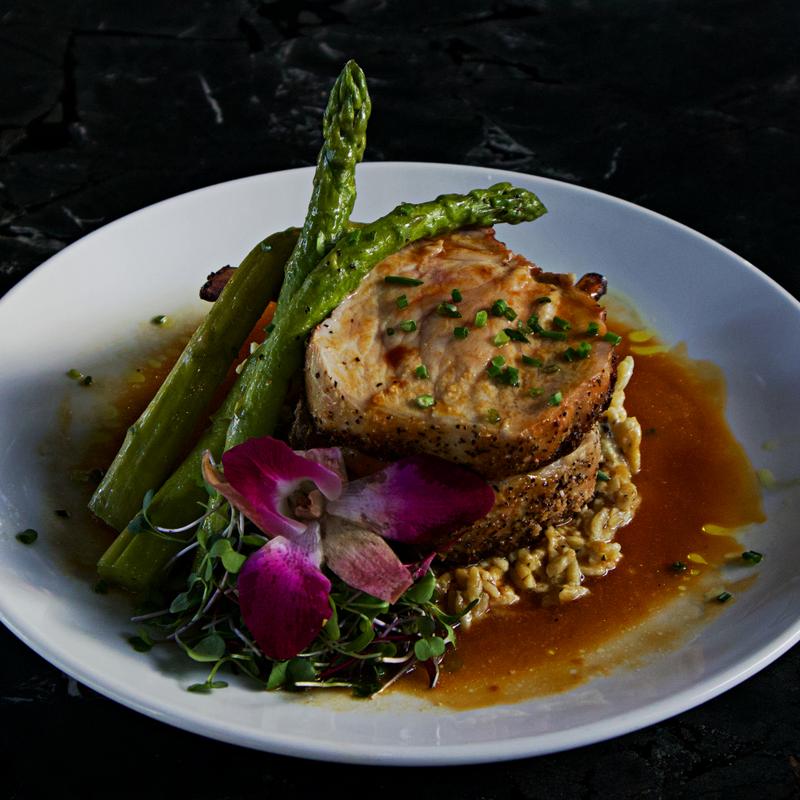 Brined and stuffed with baby spinach, prosciutto, Maytag blue cheese, house-made chicken jus with a gorgonzola mornay sauce, chateau potatoes, baby carrot, and asparagus cooked in a buttered vegetable broth.