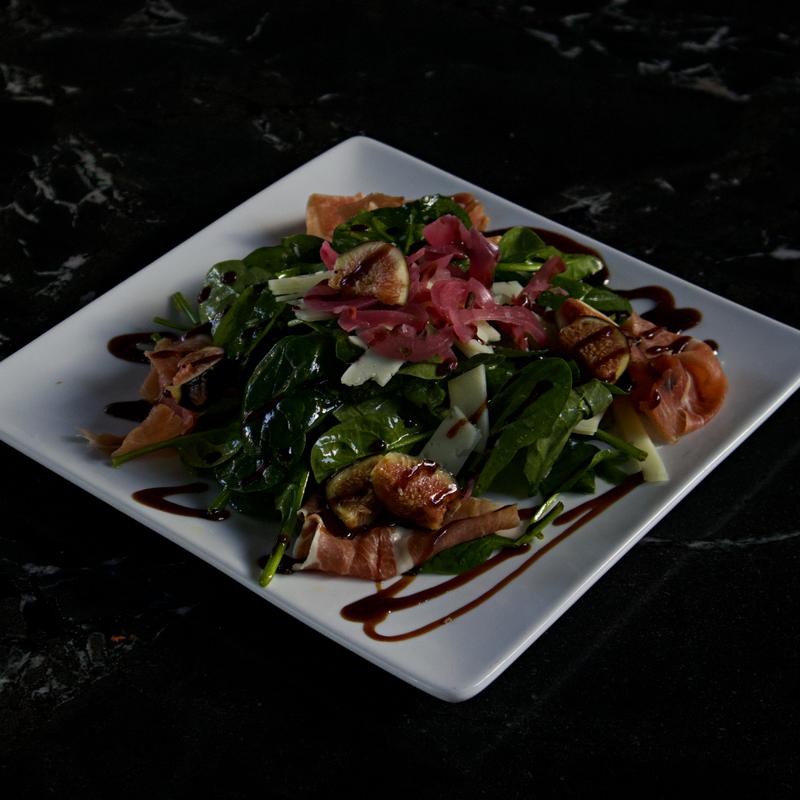 baby spinach, fresh fig, red onion, manchego cheese, prosciutto, herb truffle