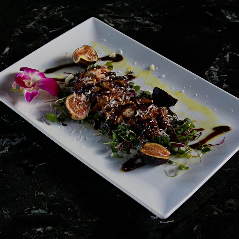 Charred sugar-cured quail, fresh fig, balsamic glaze, shaved parmesan,